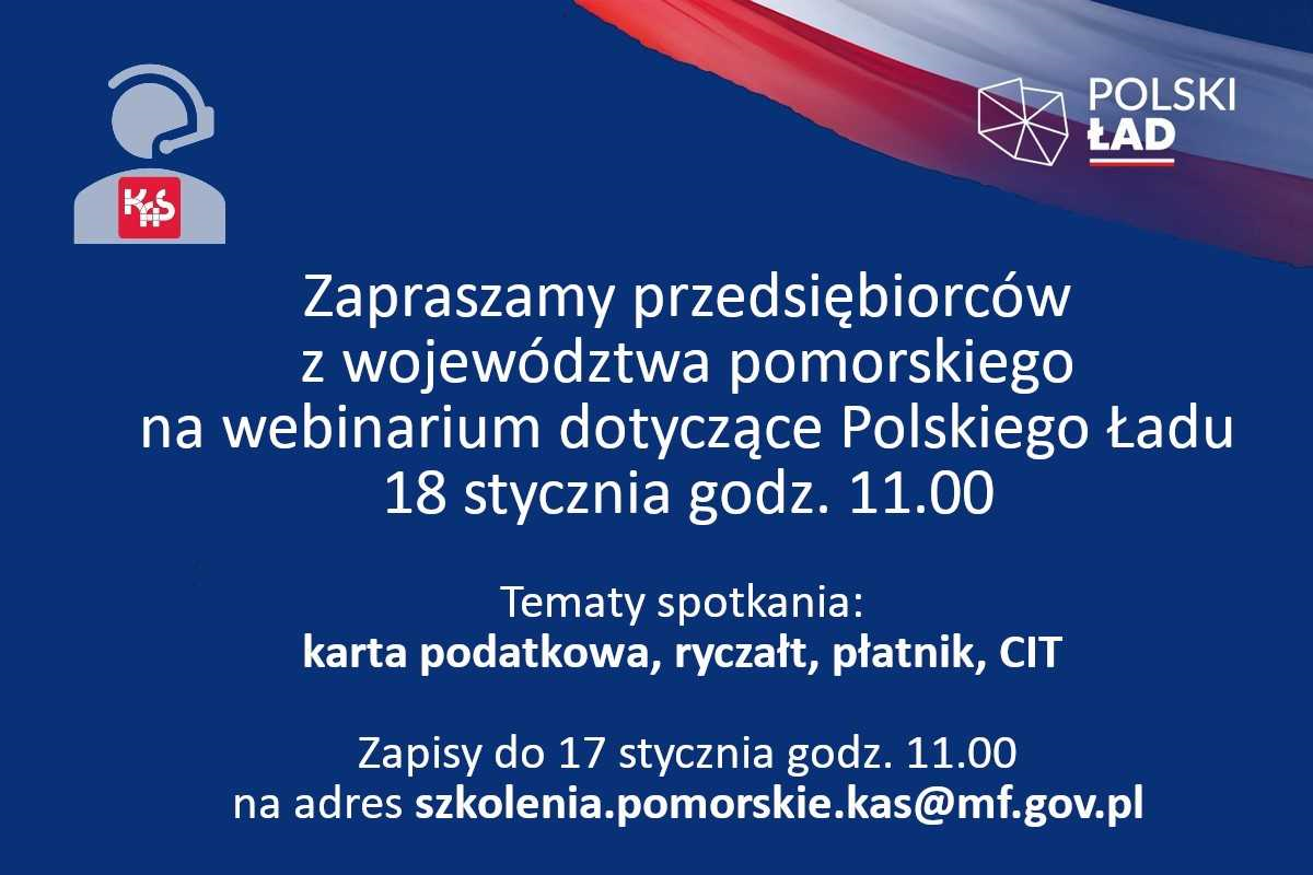 Zapraszamy przedsiębiorców z województwa pomorskiego na webinarium dotyczące Polskiego Ładu, które odbędzie się 18 stycznia o godz. 11.00.