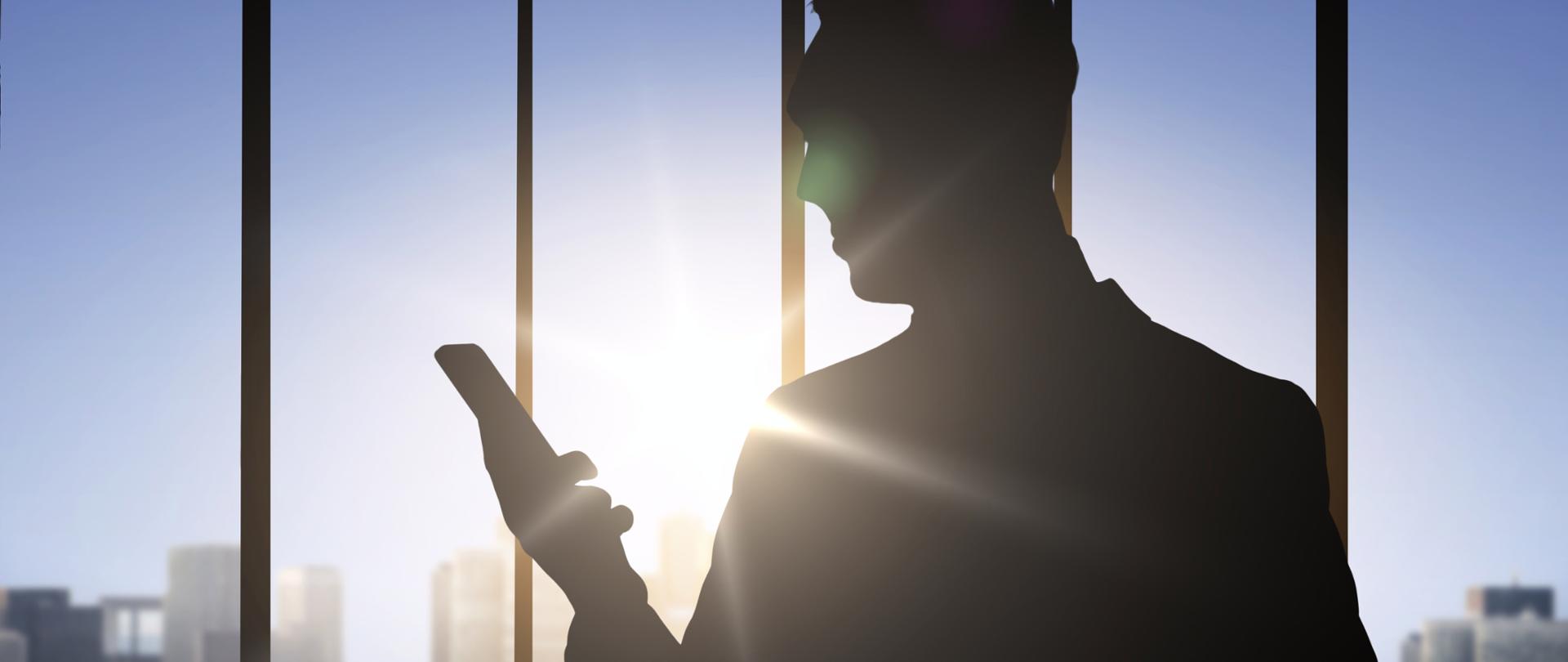 Ciemna postać mężczyzny ze smartfonem na tle świecącego słońca